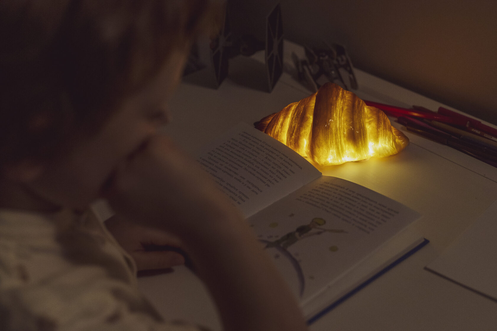 Soe Sai Croissant Lamp - A Unique Blend of Warmth and Light A lamp crafted from a real croissant, baked fresh in a bakery in Tallinn. What is Soe Sai? "Soe Sai" means warm bread in Estonian, and this lamp embodies that concept. It's a glowing, unique piece that radiates a soft, warm light, bringing a cozy, inviting atmosphere to any space. Is Soe Sai made from real bread? Yes, Soe Sai is crafted from real bread. We hollow out the bread and apply an antibacterial coating to preserve it. Although the bread looks incredibly lifelike, please note that it is not edible. Does Soe Sai grow mold? Each lamp is treated with a special antibacterial coating to keep it safe. If the coating is damaged, moisture may cause mold to form. Handle with care to maintain its pristine condition.
