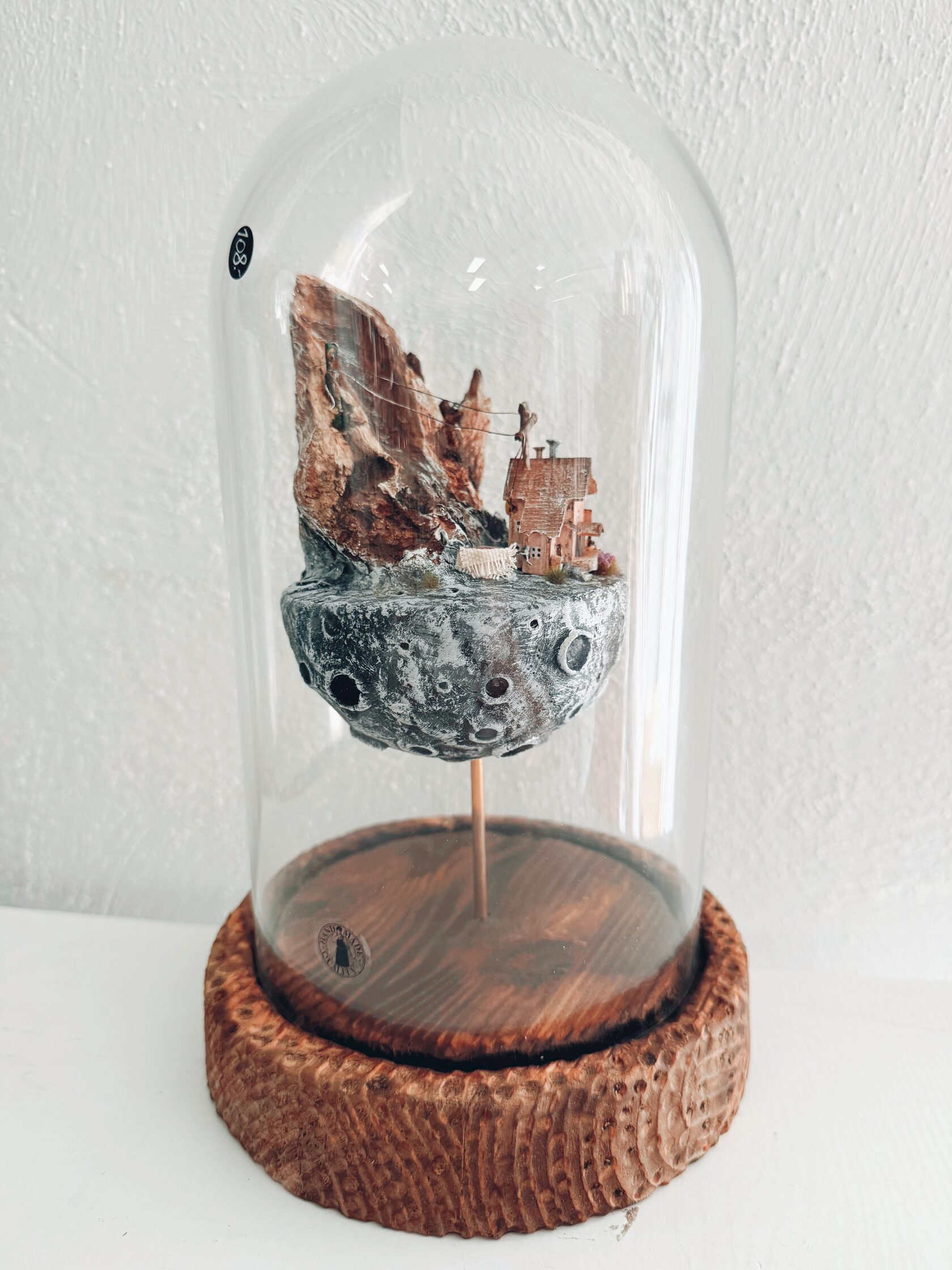 A small house perches close by, humble and patient. Its wires stretch back to the moonlit rock, like whispers of connection across distance. Beneath a delicate dome, a line of white laundry dries — a simple routine that feels timeless under a watchful lunar sky. Each element is gathered by hand along Estonia’s wild shores. Nothing is shaped or cut — every piece keeps its natural edges, its salt, its secrets. Assembled slowly in our studio, Moon Routine Driftwood is one of a kind: a reminder that even our ordinary moments — like hanging laundry at dusk — can glow with quiet magic.